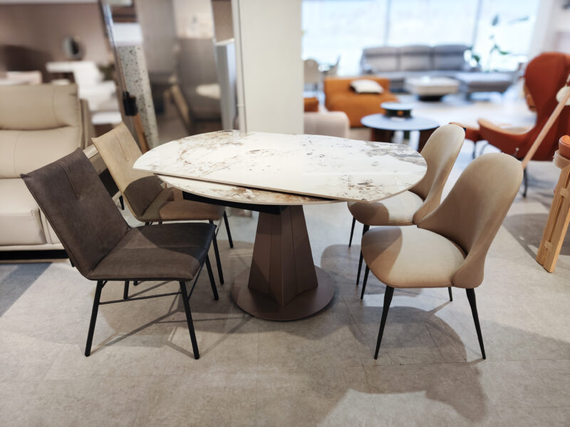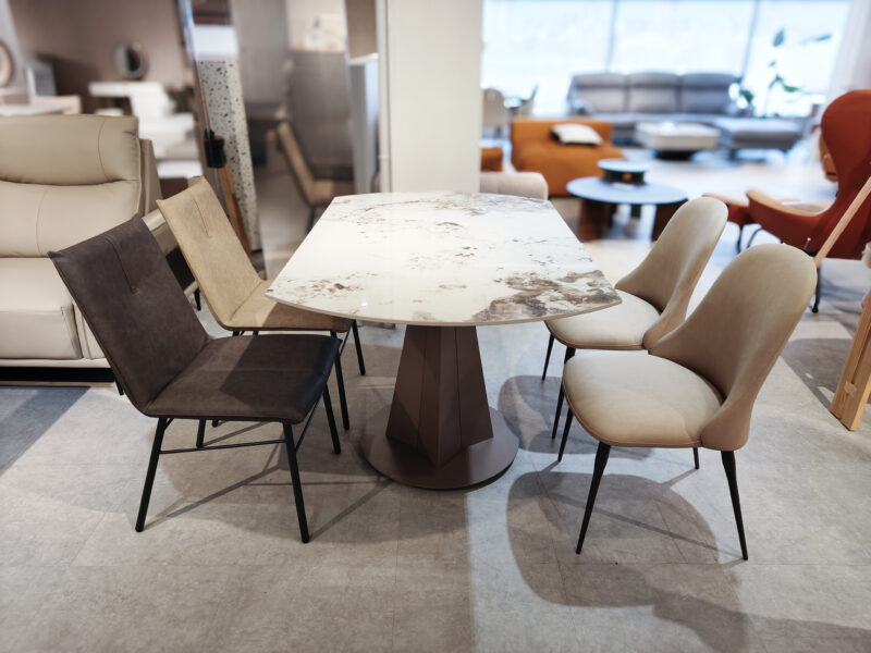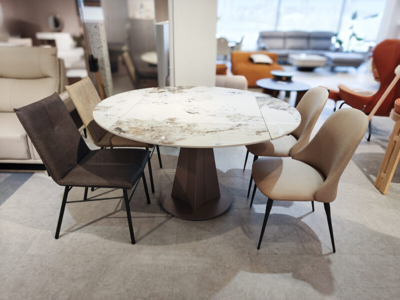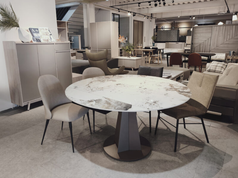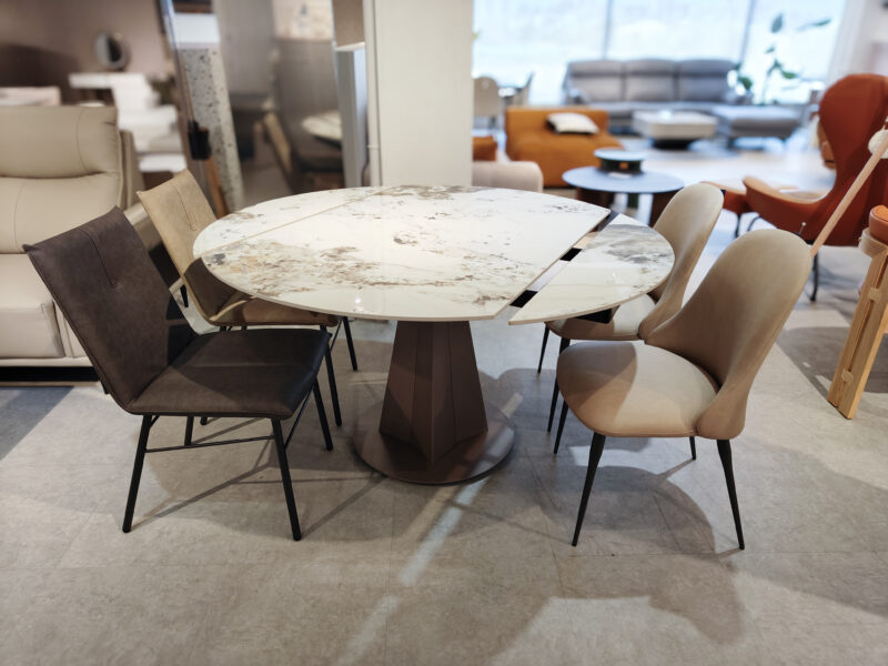 一張特別的餐桌,可以由方變形成圓桌,岩板餐桌有各種花色可選。