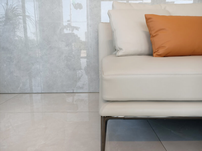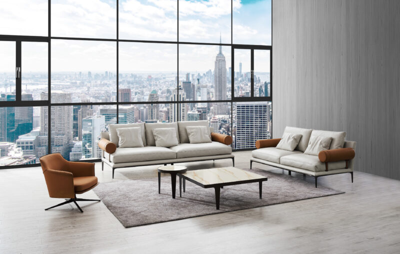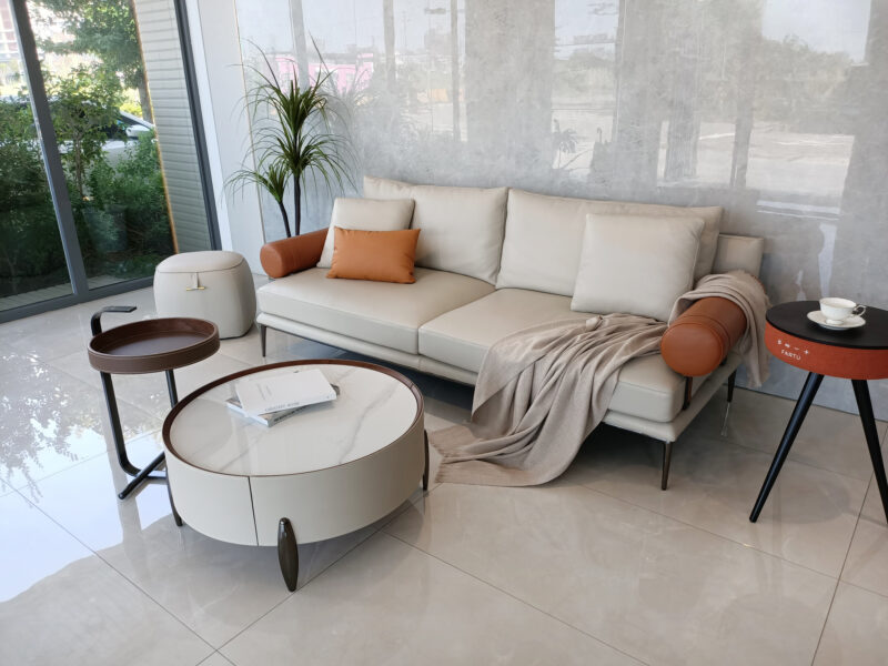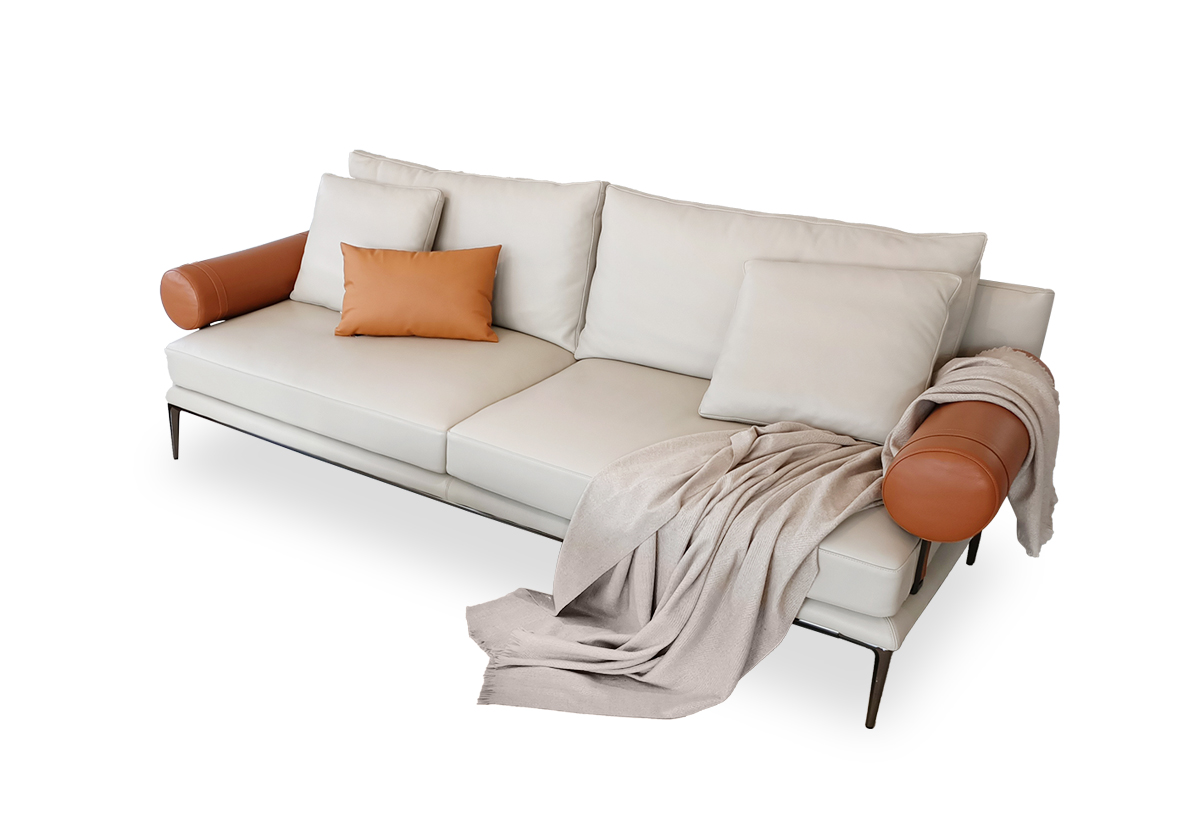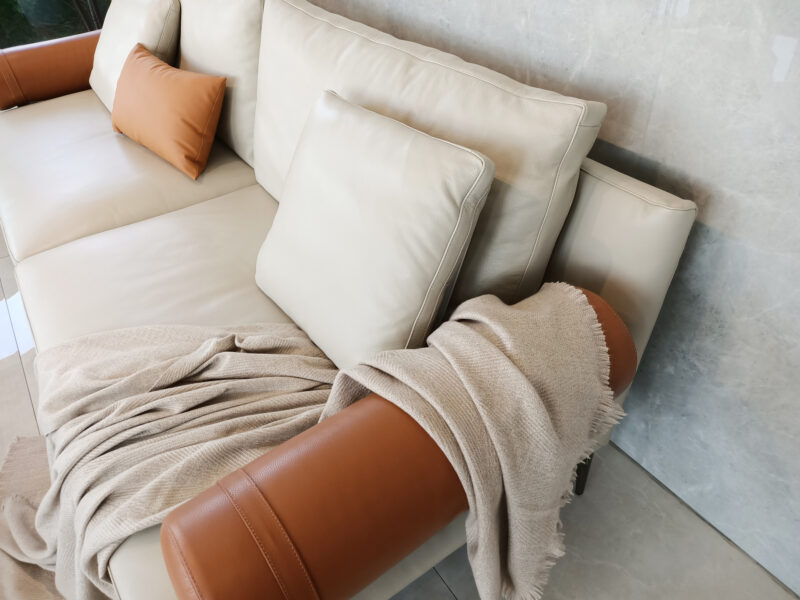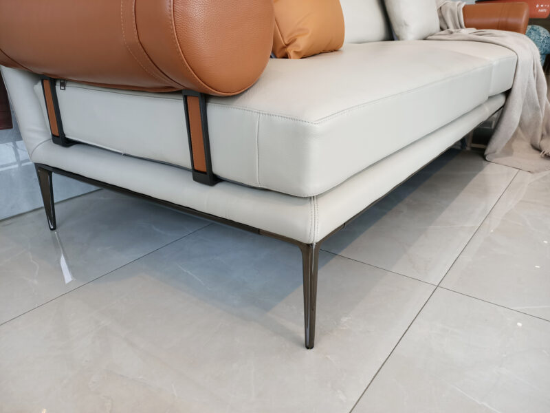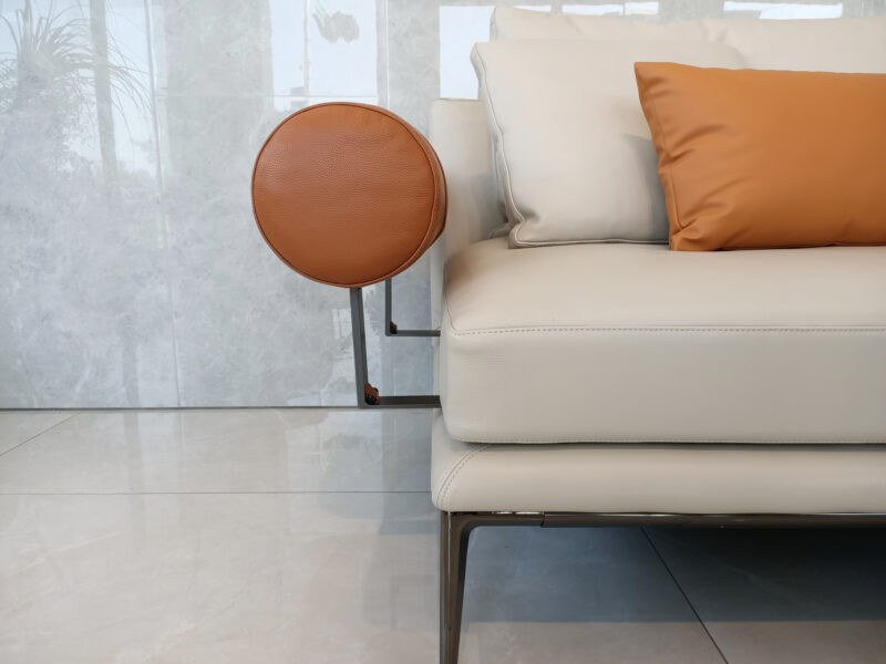 非常現代感的一張沙發,全牛皮的材質,圓筒形的把手,高腳掃地機器人可以進。