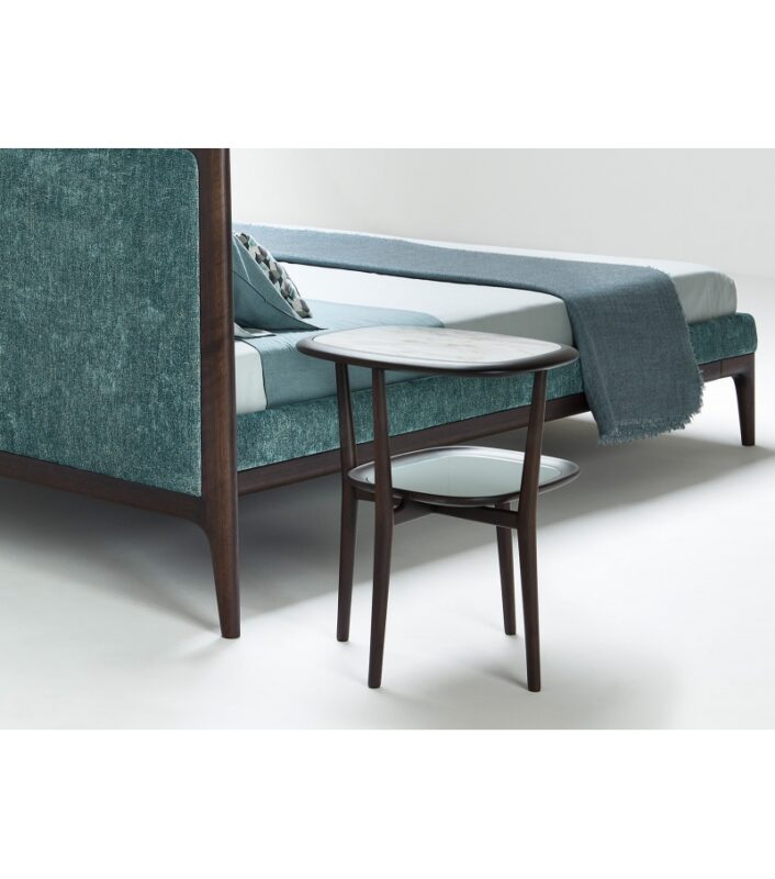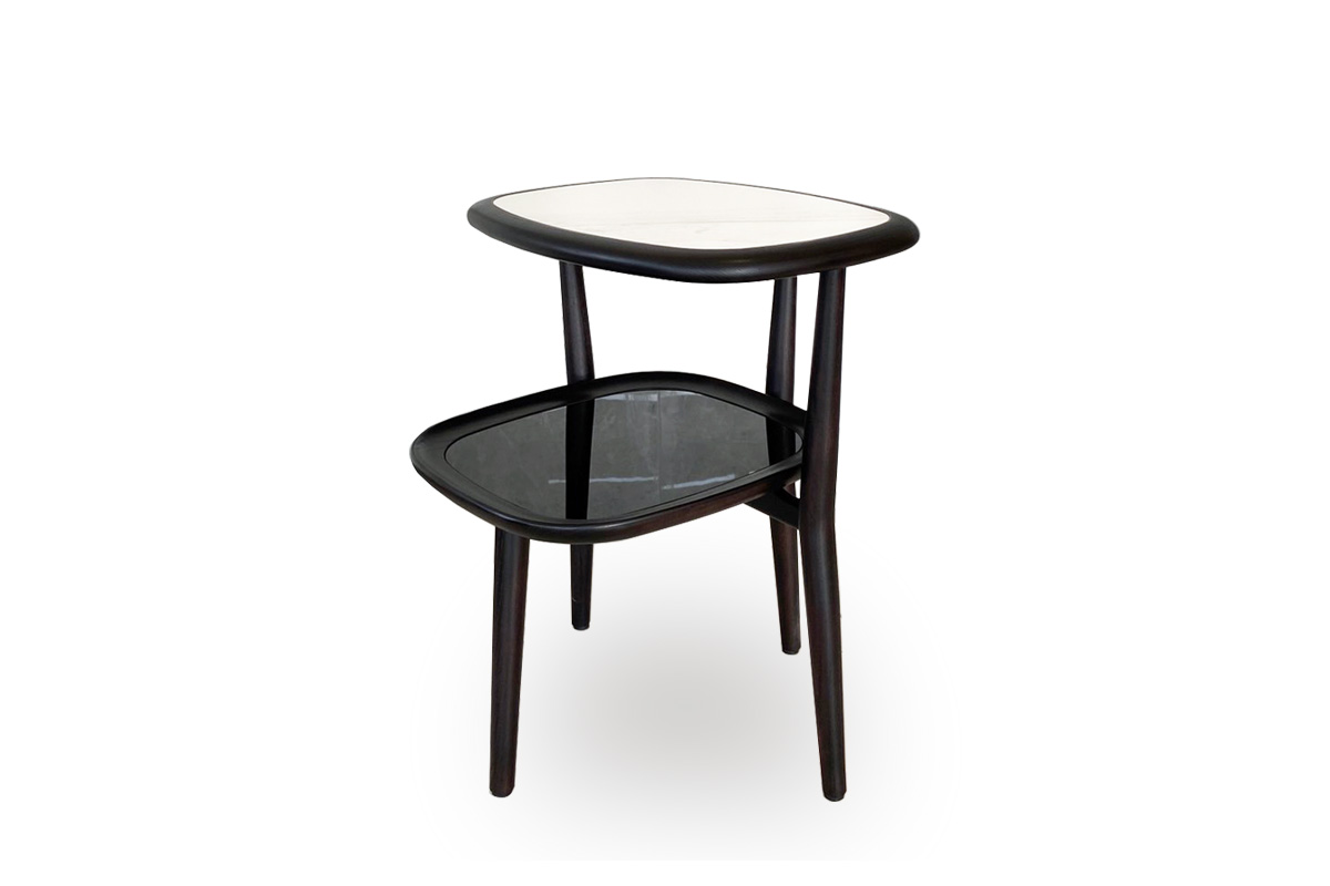 是一款木質結構的邊几,上桌面為陶板,下桌面為玻璃。相當有現代感的邊几