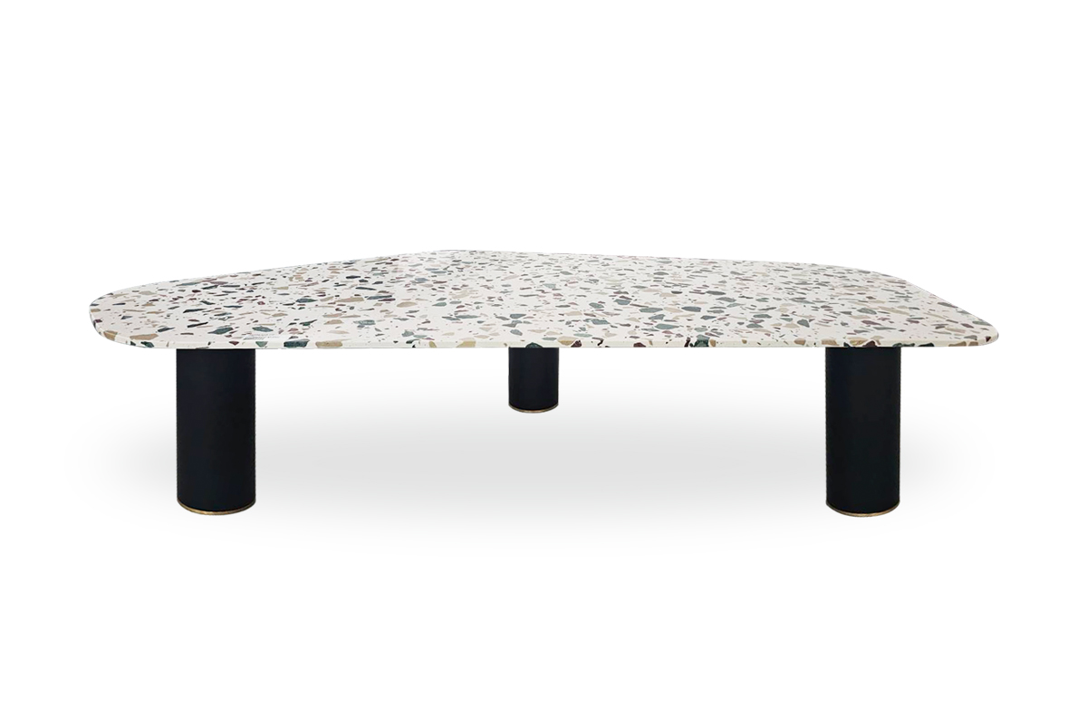 厭倦了茶几不是方就是圓嗎?這款茶几採不規則的多邊形,邊角都有倒角,加上色彩繽紛的水磨石桌面,讓你的空間多了一點設計感又活潑。