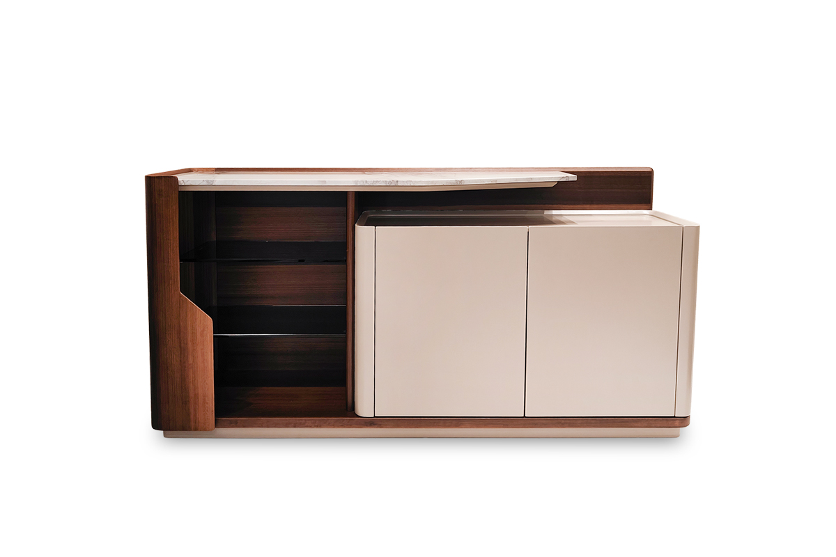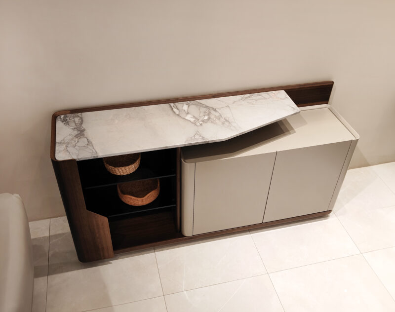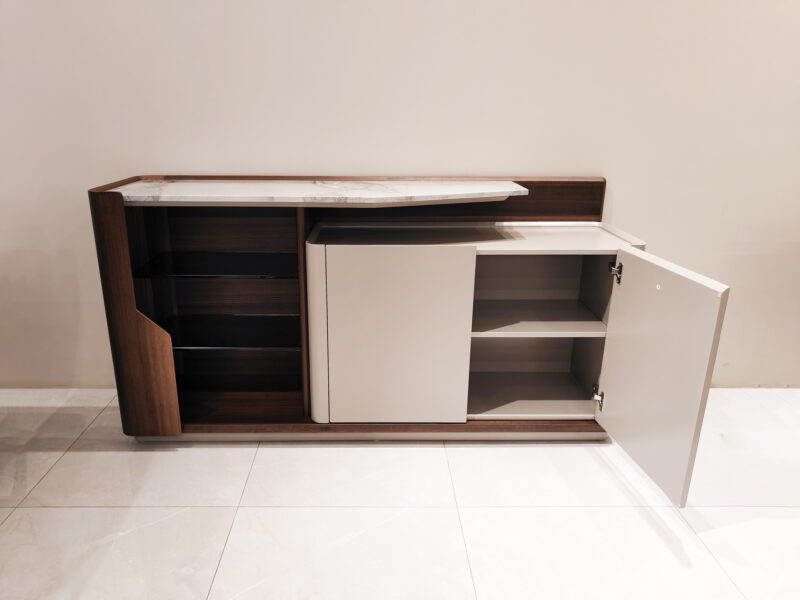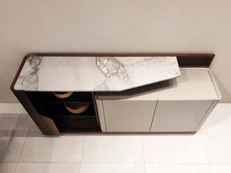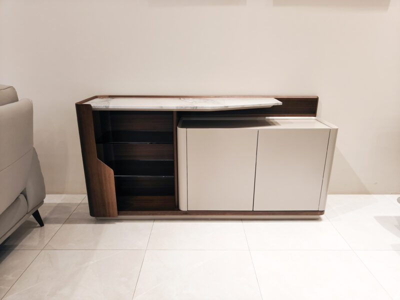 具耐高溫耐磨耐刮不易髒好清潔的岩板造型餐邊櫃,半開放式多層方便收納與展示,木材溫暖深沉的色調形成強烈對比。