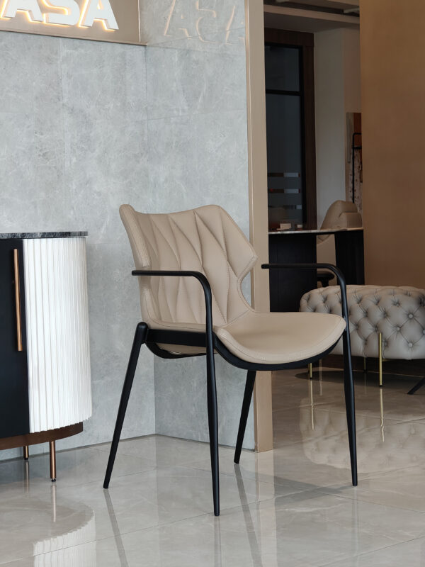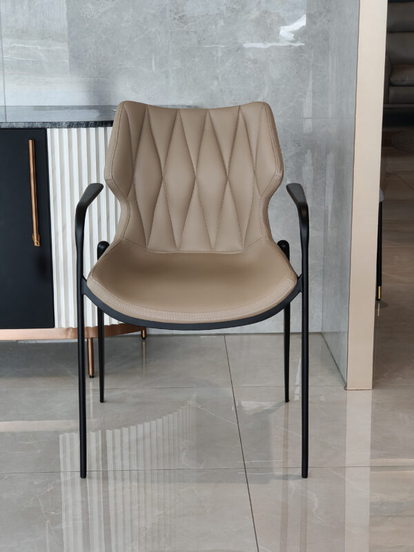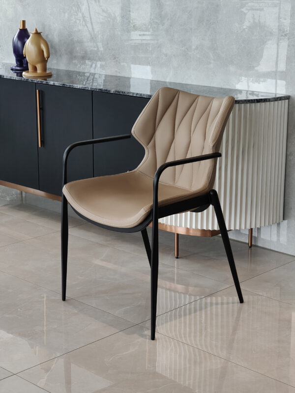 奶茶色弧形椅背時尚餐椅,具流動感的外型設計,耐磨透氣皮革,光滑有曲度的扶手及椅腳,微傾斜曲線靠背,貼合背部展現有力度且舒適之坐感!