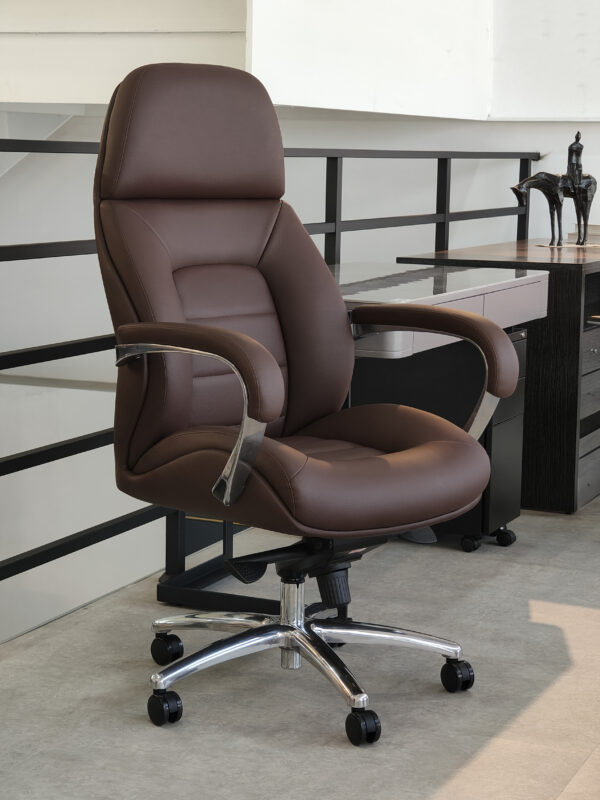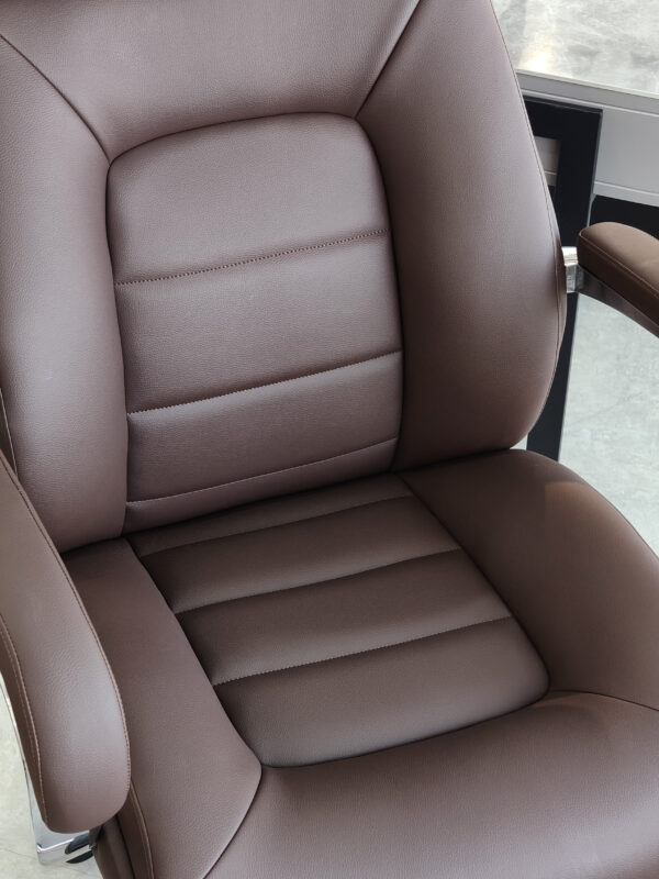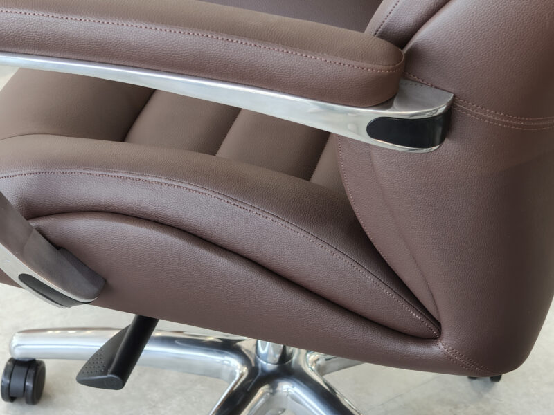 西皮,定型棉座背,鋁合金扶手,豪華底盤鎖定三個角度,拋光鋁合金麵包腳帶60大輪,電鍍三級氣杆